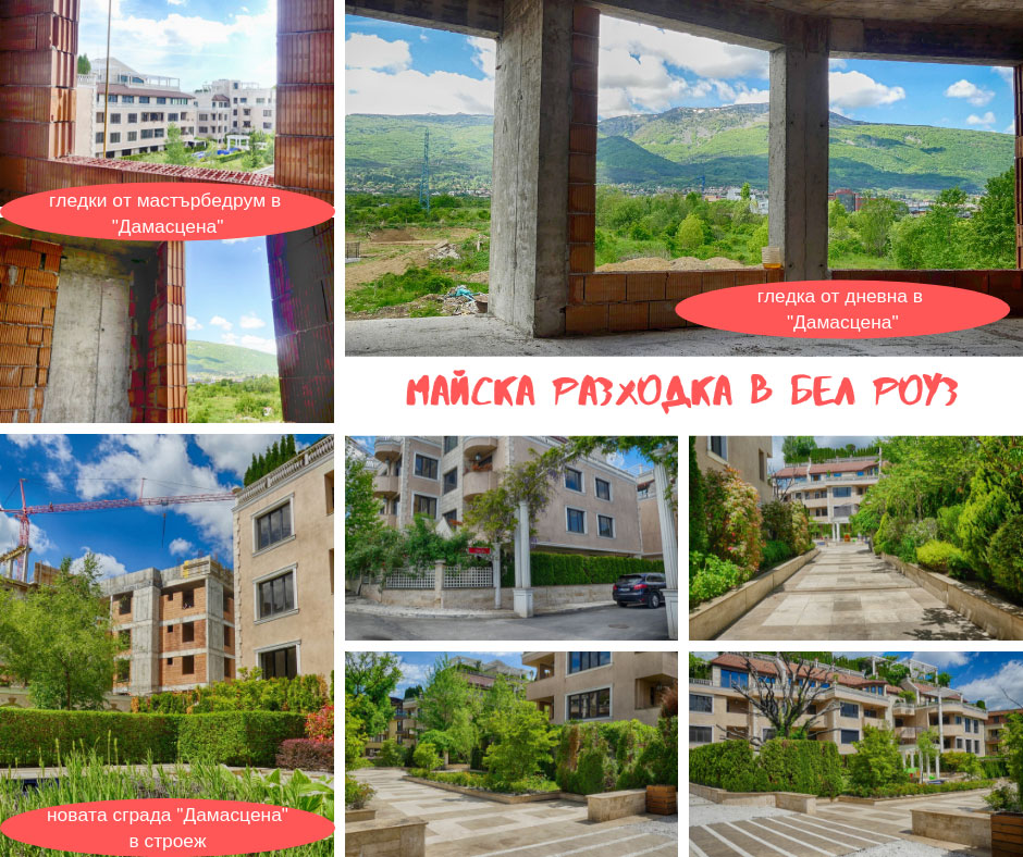 В слънчев майски ден съчетахме инспекцията на строителството на 3-те нови сгради в жилищен комплекс „Бел Роуз” с приятна разходка сред избюяващата зеленина и разпъпващи първи цветове на розите за тази година в парковата среда на първата му част.